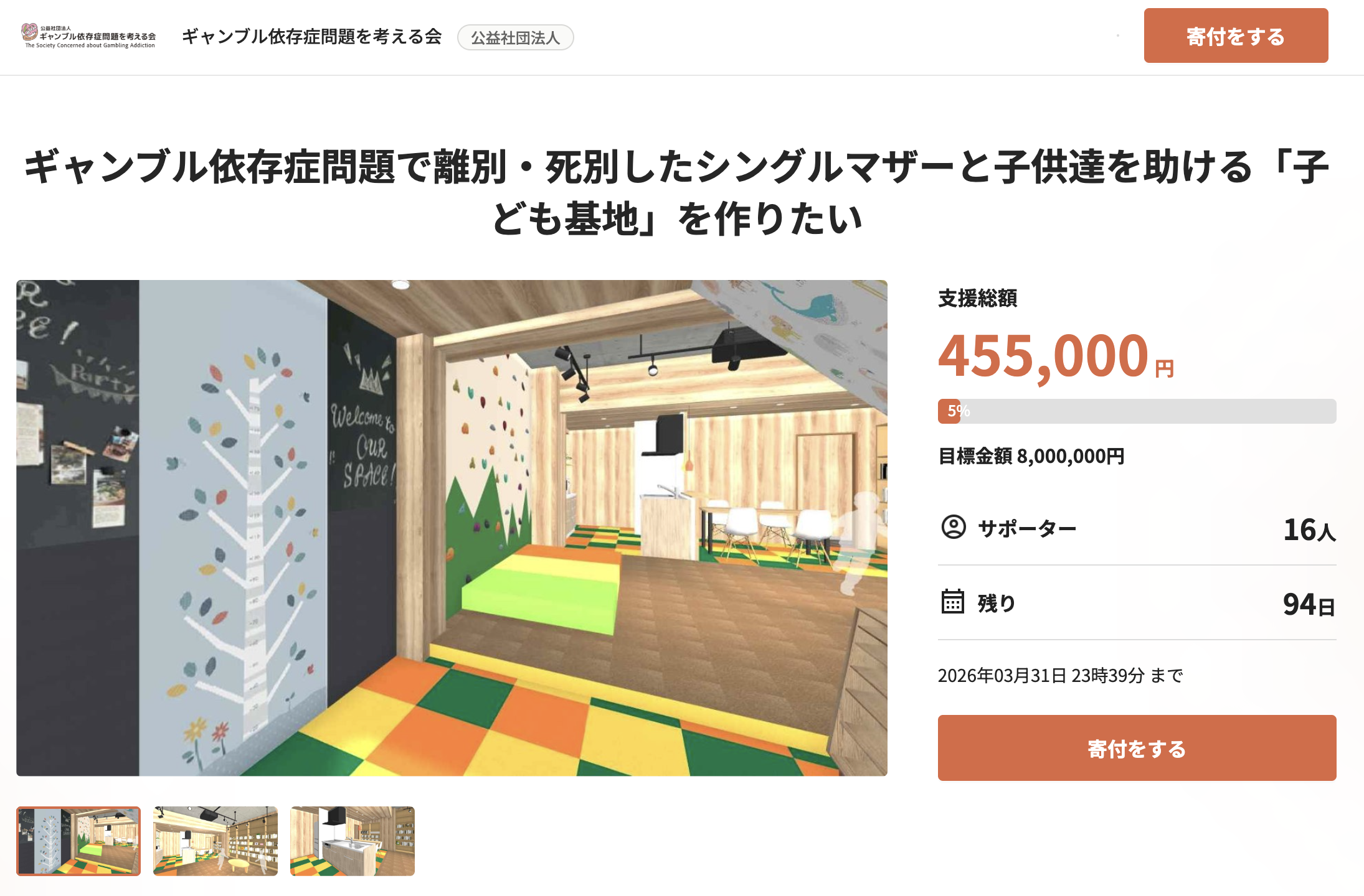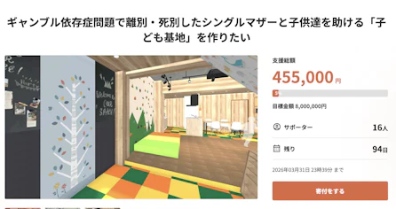 ギャンブラーの元夫がいると、離別、死別した後も、シングルマザーや子どもたちは経済的、精神的に苦境に立たされがちです。ギャンブル依存症問題を考える会は、そんな仲間を助けるべく、つらい思いをしているシングルマザー家庭の母子が集うことのできる「子ども基地」を作ります。クラウドファンディングで改装費の寄付を募ります。