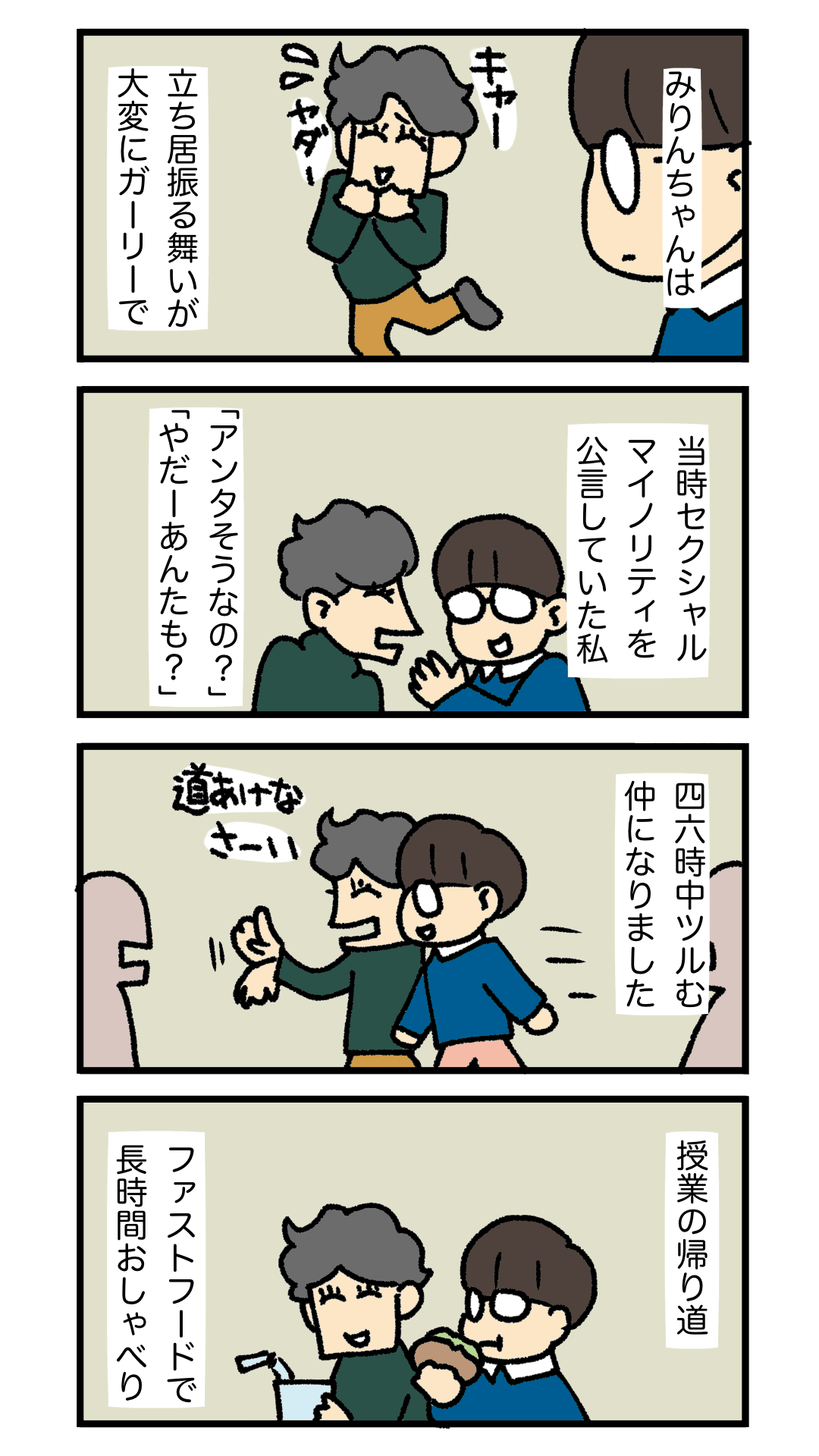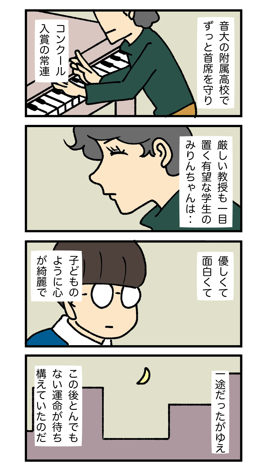時はバブル期、音大で出会った声楽専攻の私とピアノ専攻のみりんちゃん。セクシャルマイノリティという共通点もあり、つるむようになりました。でも、純粋なみりんちゃんには、この後とんでもない運命が待ち受けていたのです。かときちどんぐりちゃんのオリジナル漫画、始まります!