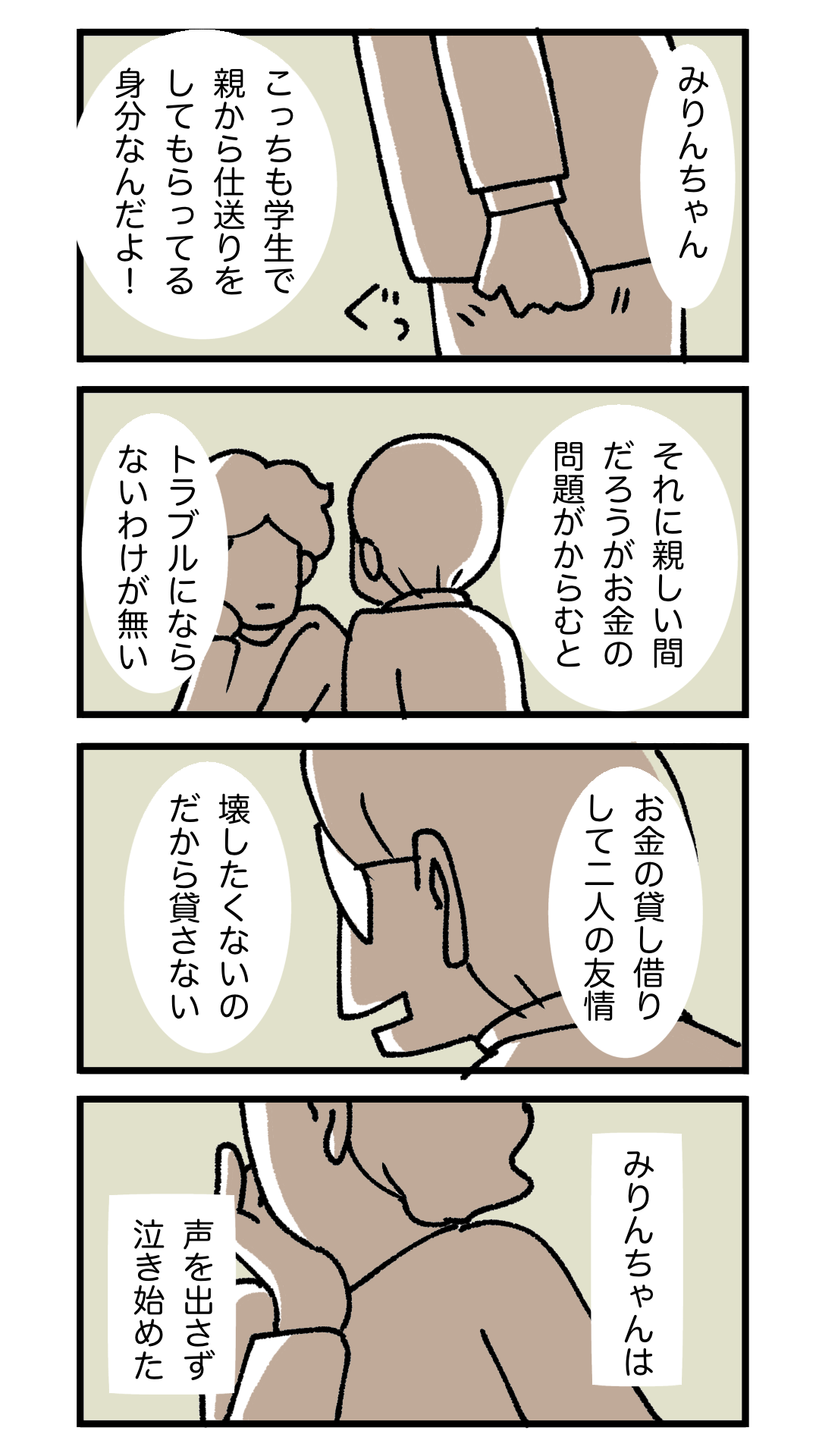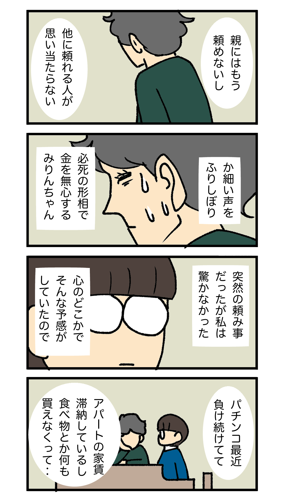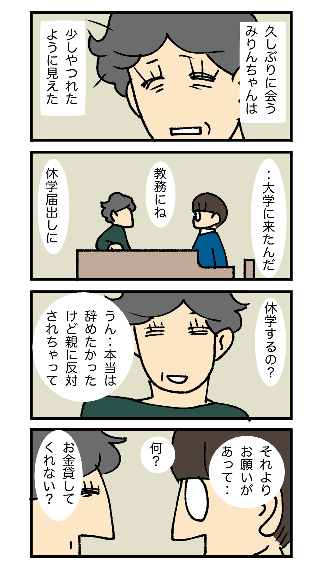 彼氏とパチンコにかまけて音大に来なくなり、ついに落第が決まったみりんちゃん。ある日、急に姿を現すと、あるお願いをしてきたのですが......