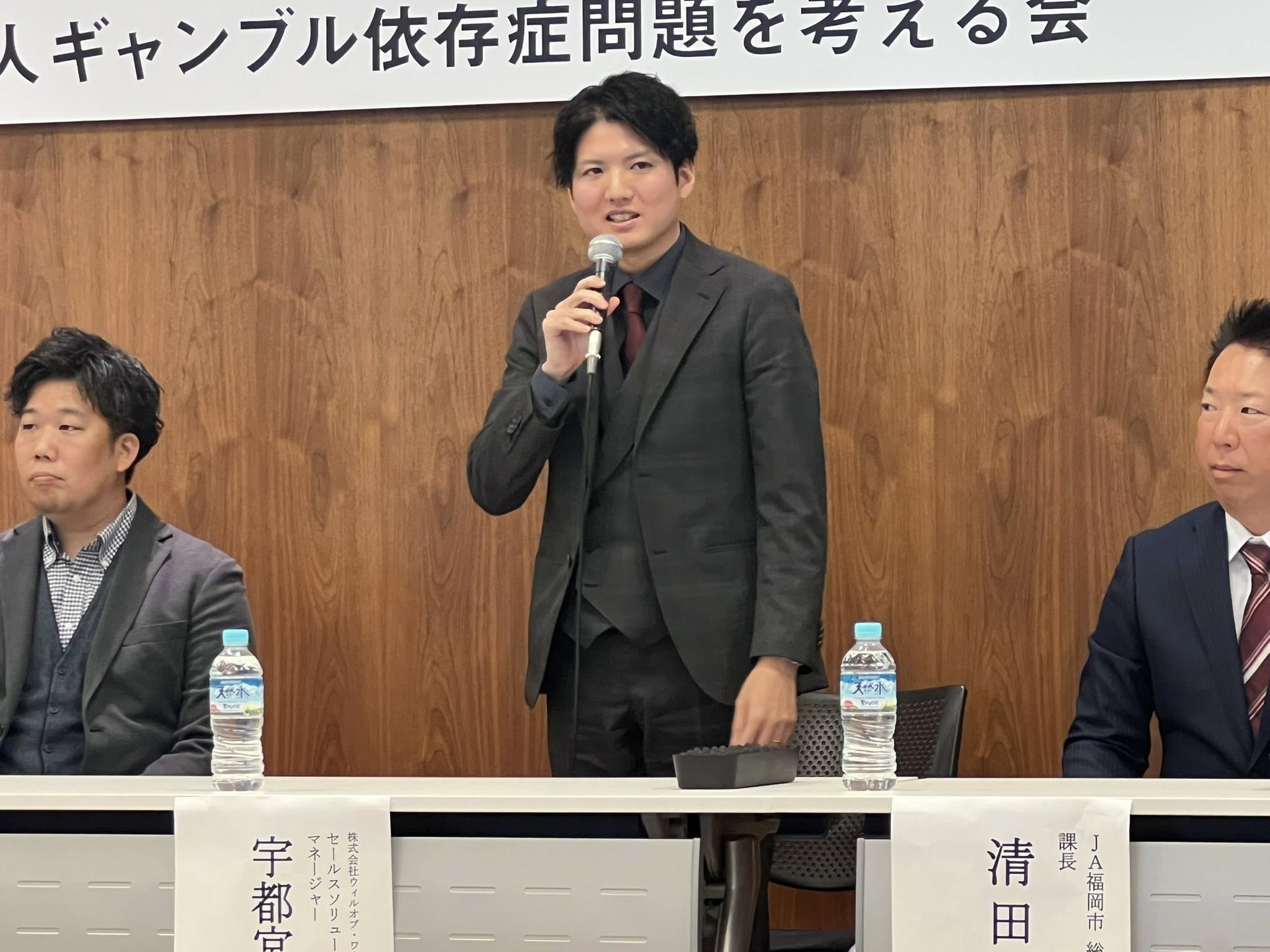 登壇したのは、防衛省人事教育局衛生官付2等空佐で、精神科医の丸田眞由子さん、JA福岡市総務部人事課長、清田裕樹さん、株式会社ウィルオブ・ワーク セールスアシスト事業部セールスソリューション営業部長、磯江怜さん、同社マネージャーでギャンブル依存症の当事者でもある宇都宮駿さん。