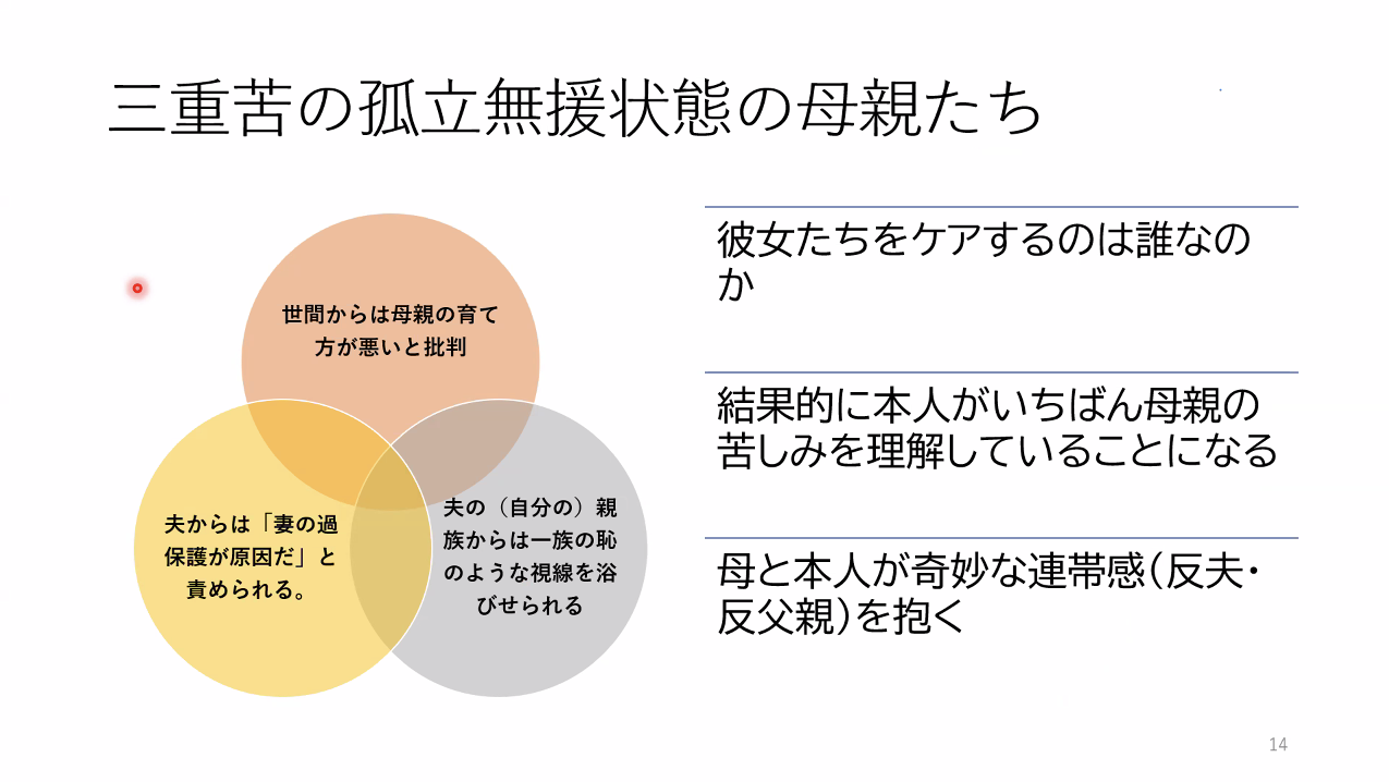信田さんは、絶縁の原因を外部に求める人たちを前に、グループワークを提供している。プログラムでは、母親の孤立した環境に理解を示しつつ、子どもとの関係のほか、配偶者との関係も見直すように促していく。